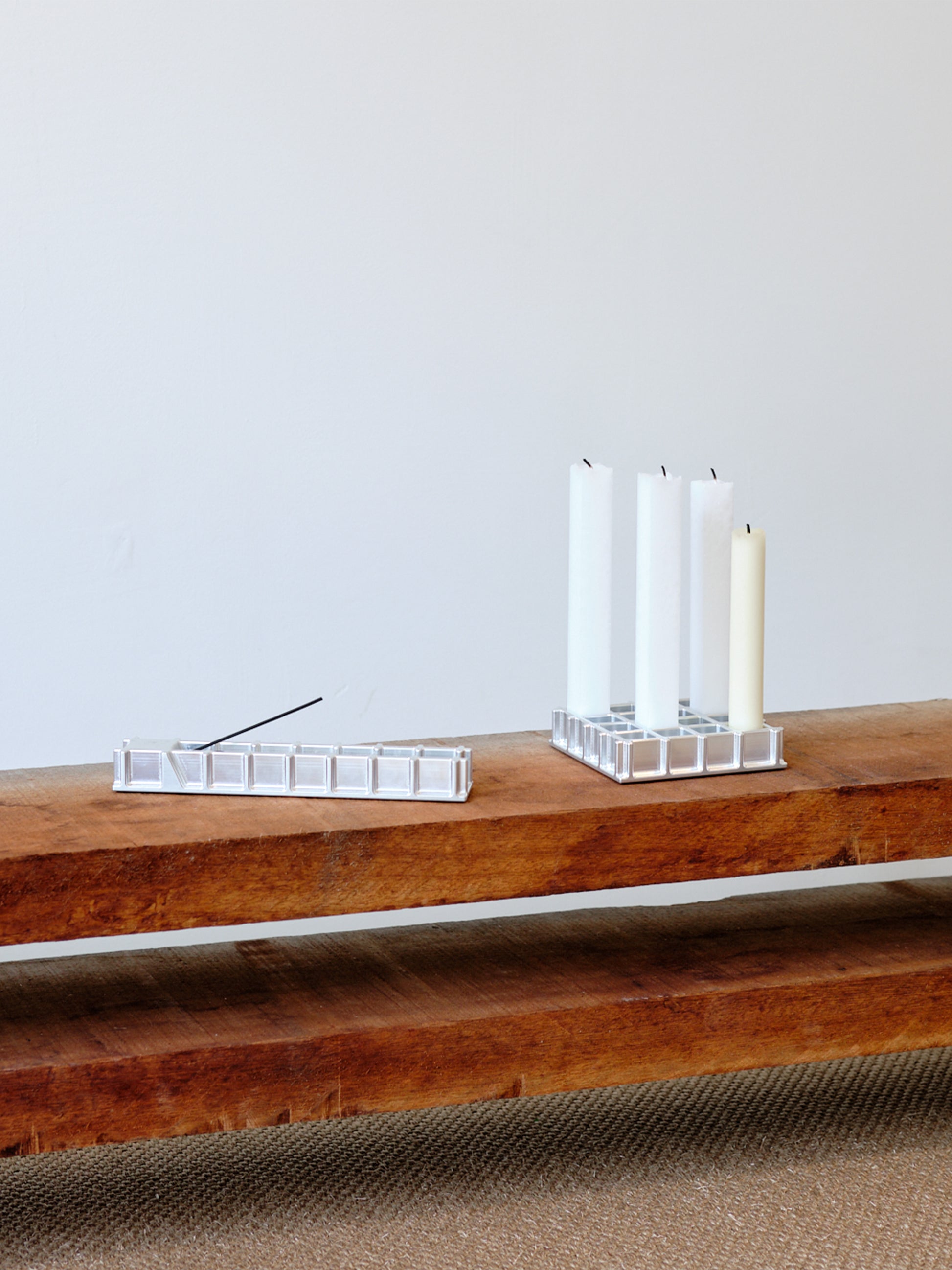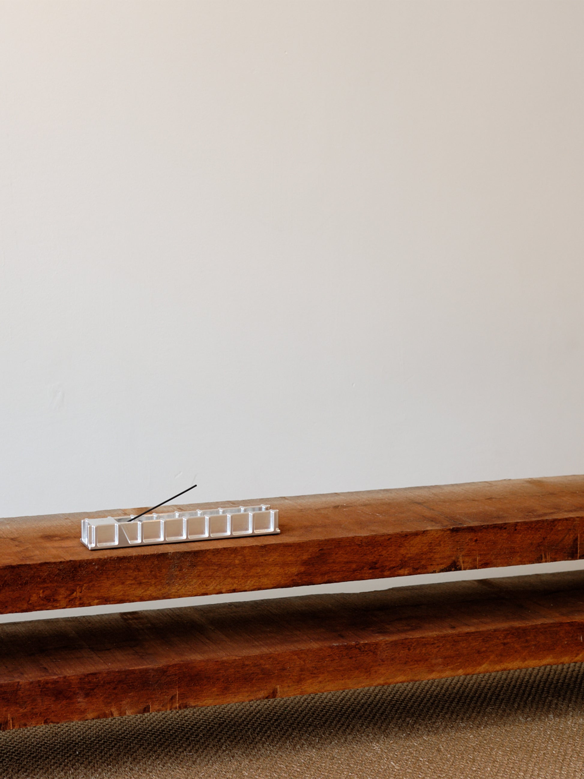 The incense holder is carved from solid aluminium, echoing the same refined lattice language. Designed to hold a single incense stick, and catch the falling ash, its interlaced form balances structure and stillness.