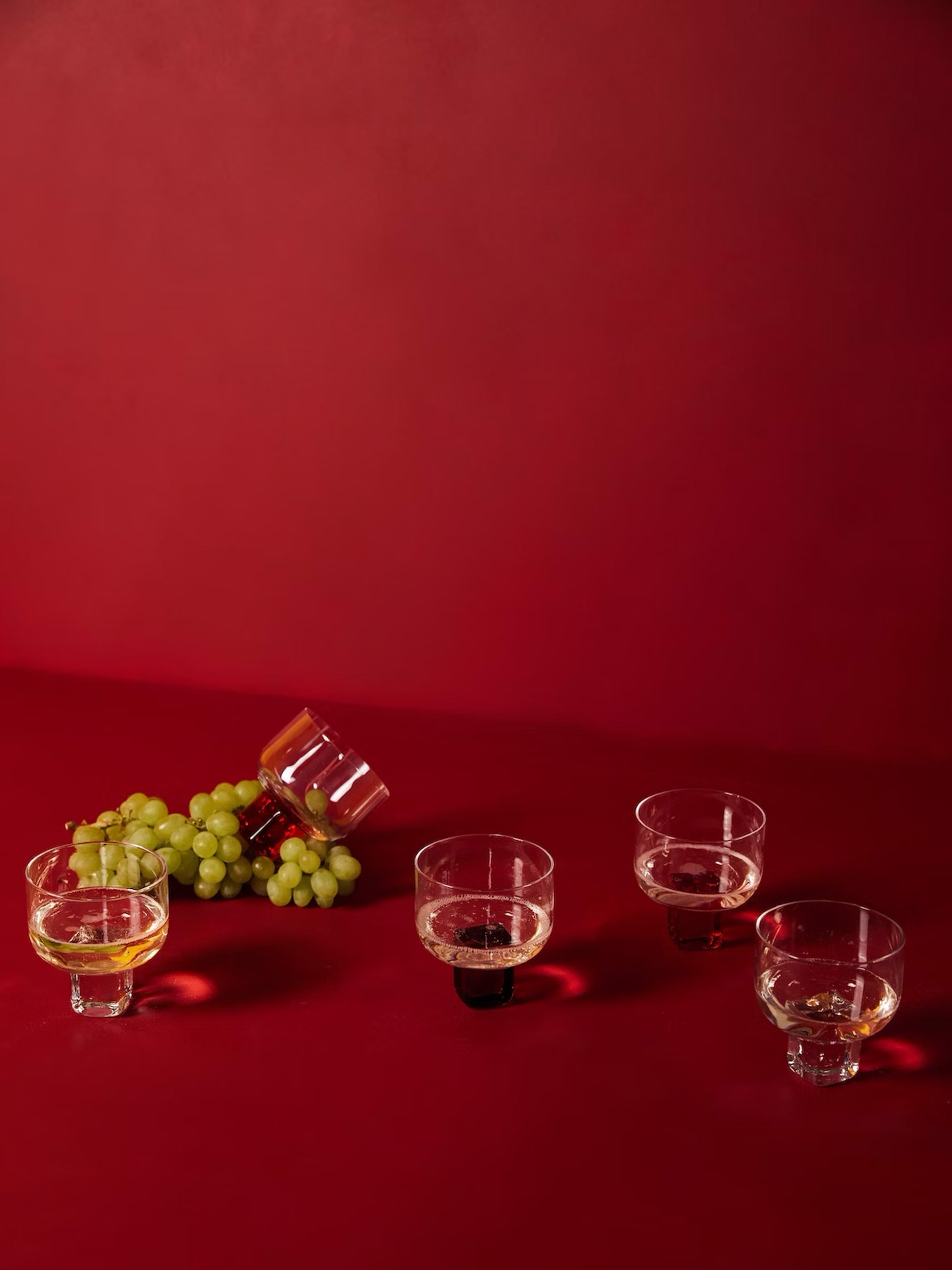 Handmade wine glass with small red stem. Because every glass is handmade, they can vary per item.